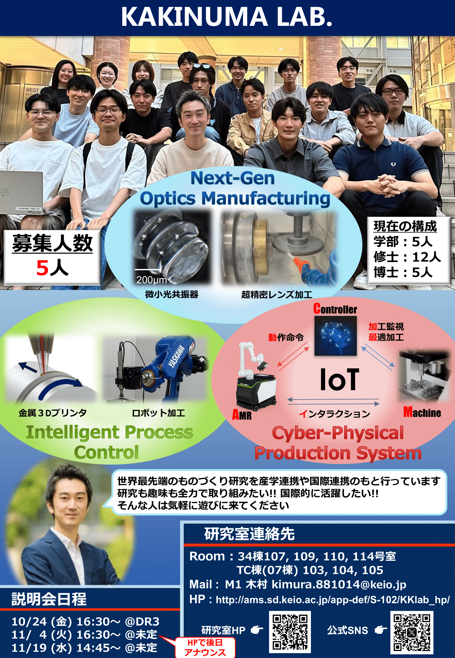 柿沼研究室の研究室説明会を下記日程で開催いたします!本年度も対面での開催となります, ぜひ気軽にお越しください! 研究室一同, 皆さんとお会いできることを楽しみにしています!